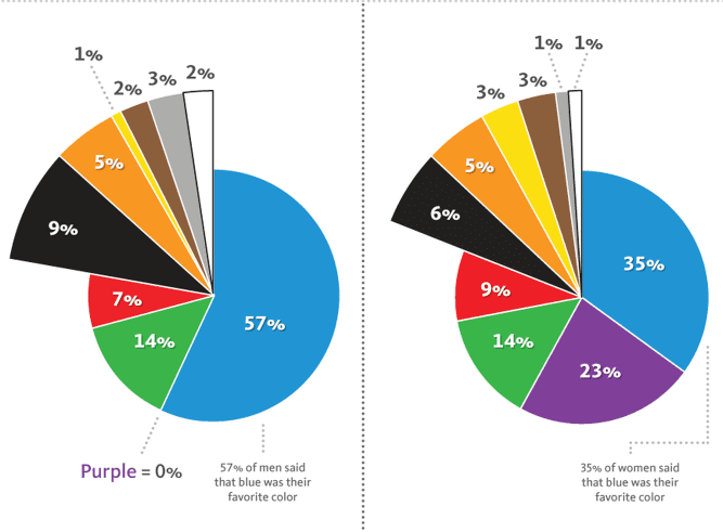 Blue is the favorite or 57% of men and 35% of women while purple is favored by 23% of women and ZERO men!
